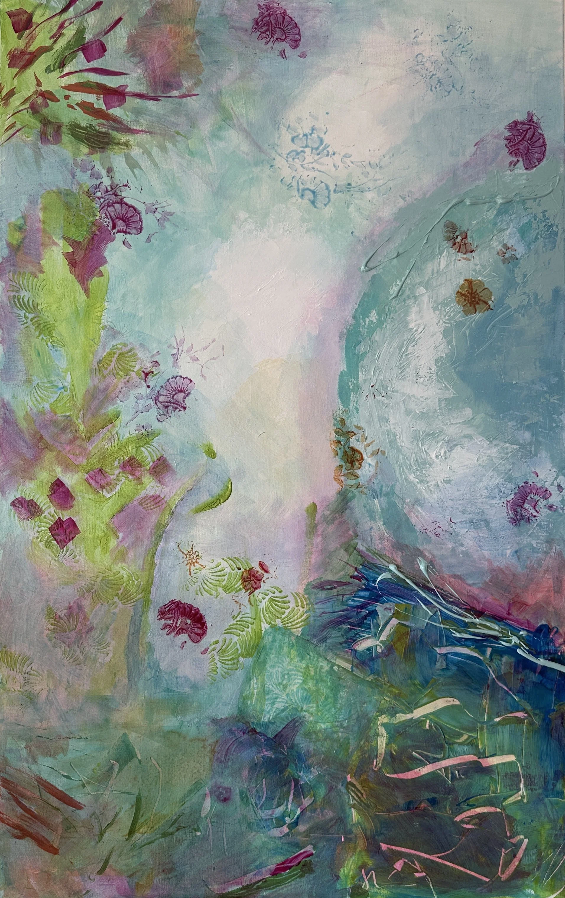 Underwater Intergalactic Acrylic and Collage on Canvas 20" x 16" 2020
